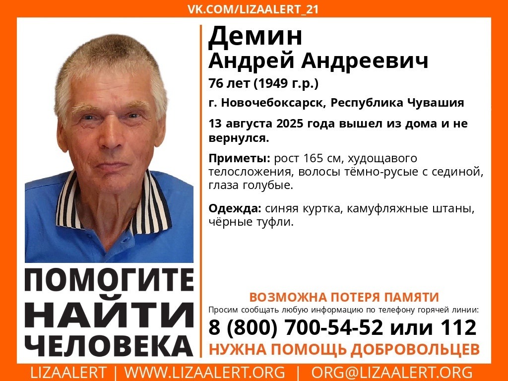 Как поисково-спасательный отряд «Лиза Алерт»,пропал Демин Андрей Андреевич. 76-летний житель Новочебоксарска 13 августа 2025 года вышел из дома и не вернулся.