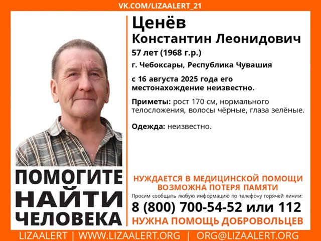 Поисково-спасательный отряд «Лиза Алерт» Ценева Константина Леонидовича. С 16 августа 2025 года местонахождение 57-летнего жителя Чебоксар неизвестно.