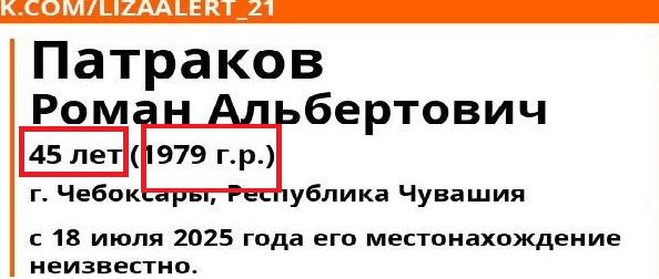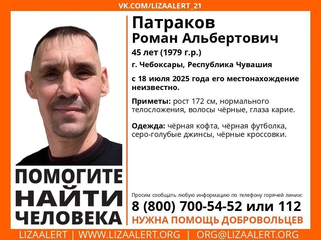 Поисково-спасательный отряд «Лиза Алерт» Патракова Романа Альбертовича. С 18 июля 2025 года местонахождение 45-летнего жителя Чебоксар неизвестно.