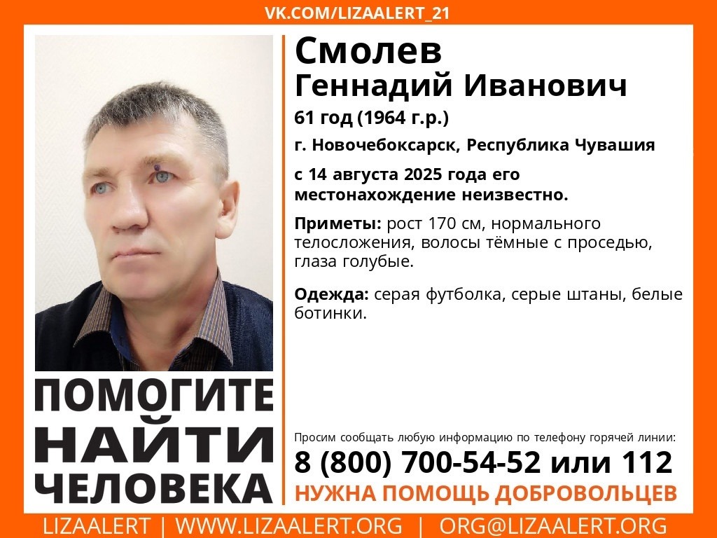 Поисково-спасательный отряд «Лиза Алерт» просит помощи в Смолева Геннадия Ивановича. С 14 августа 2025 года местонахождение 61-летнего жителя Новочебоксарска неизвестно.