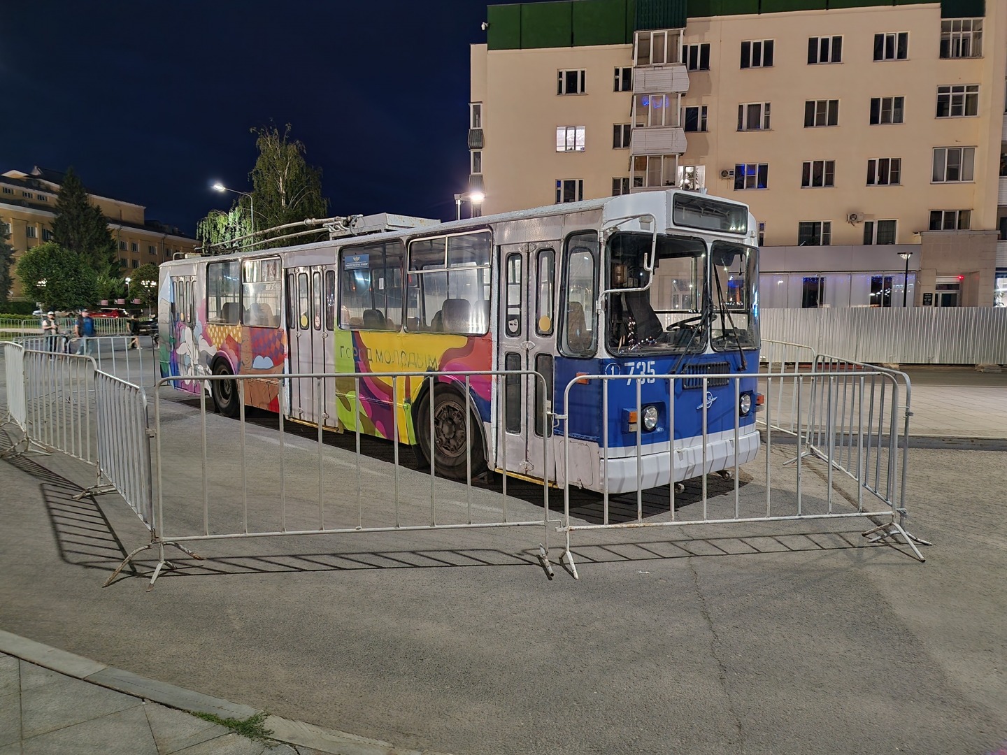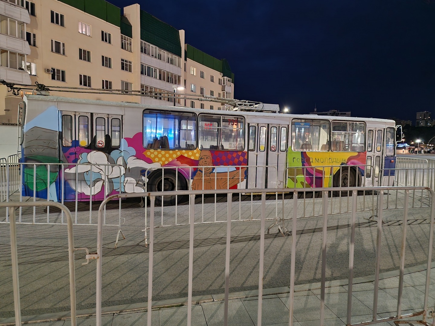 На троллейбусе написано: "Город молодым", но двойной слой заборов вокруг троллейбуса наводит на нехорошие мысли:
