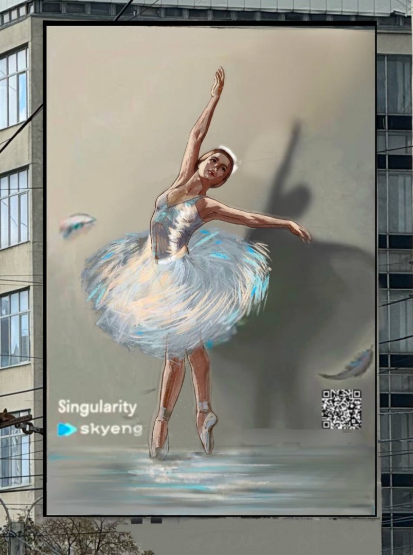 Выглядит оно как реклама SkyEng. Но только не топорная, а немного косвенная. Но сами авторы работы преподнесут это, как "подарок Георгия Соловьёва городу". Он был и был таким подарком, если бы не было упоминания SkyEng. И стать востребованным среди горожан этот мурал может только в контексте долгого ожидания балета.
