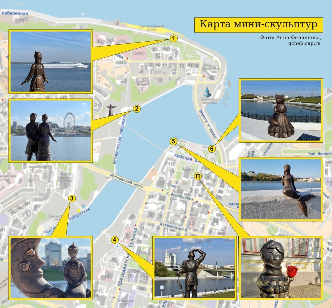 Напомним, в сентябре прошлого года на Московской набережной и заливе появились маленькие скульптуры героев чувашских сказок. Они сделаны из металла, их высота до 30 см. Мини-фигурок пока шесть, это «Лисица-плясунья», «Русалочка Волга», «Красавица Плаги», «Девушка на Луне», «Нарспи и Сетнер», «Богатырь Улып». Где они точно находятся, можно посмотреть здесь и на карте.